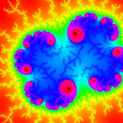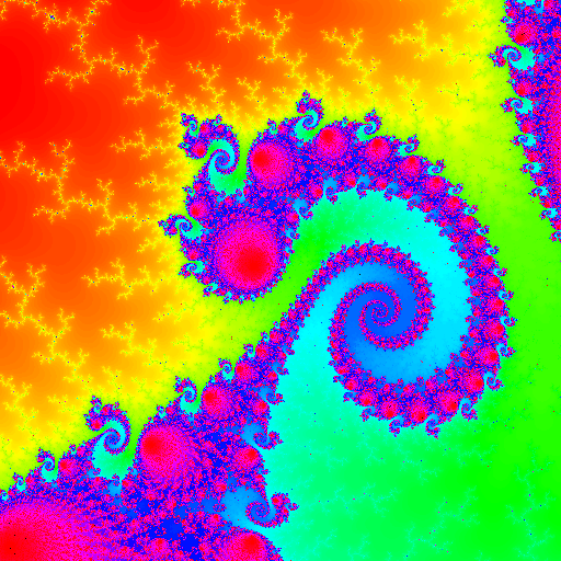 Here's a region I call Bird Of Paridise. It is from a deep zoom, but more importantly, it's deep in a region that is extremely expensive to render, which was my goal. This particular image required over one trillion iterations of the Mandelbrot function to complete. It also contains a very extreme range of exit values which demonstrates the value of my color selection algorithm. Try calculating it yourself using just about any other fractal image generator and you'll likely only get a chaotic mess. Here is the image data for the Bird of Paridise region: