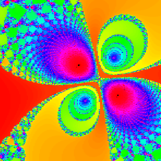 This one is perhaps my favorite since I feel that it has a very good balance of complexity, smoothness and variation. Note that the choice of colors in the pallet is independent from the algorithm that maps them to ranges of exit values and that the pallet can easily be manipulated after the image is produced. The particular color map I used with all the images on this page is admittedly garish and any artist should have no problem improving on it. I choose it simply because it gave a wide variation in hue.
