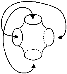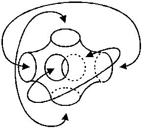 Euler first discovered the formula F-E+V = 2-2g which relates the number of faces, edges and vertices of a polyhedron to it's genus. At first glance this formula seems to say that the genus of any infinite polyhedron must also be infinite. That even seems natural since IRPs have an infinite number of tunnels. This view is misleading however. A much more powerful application of Euler's formula to infinite polyhedra is to apply it to a minimal repeat unit which can be used to create each IRP. Repeat units are familiar to crystallographers who describe different crystal structures in terms of small clusters of atoms which are arrayed in different ways in three dimensions much like the ways bricks can be arrayed in two dimensions. This method is also useful and natural when describing infinite polyhedra. Imagine a minimal repeat unit of an IRP which has the topology of the following figure: