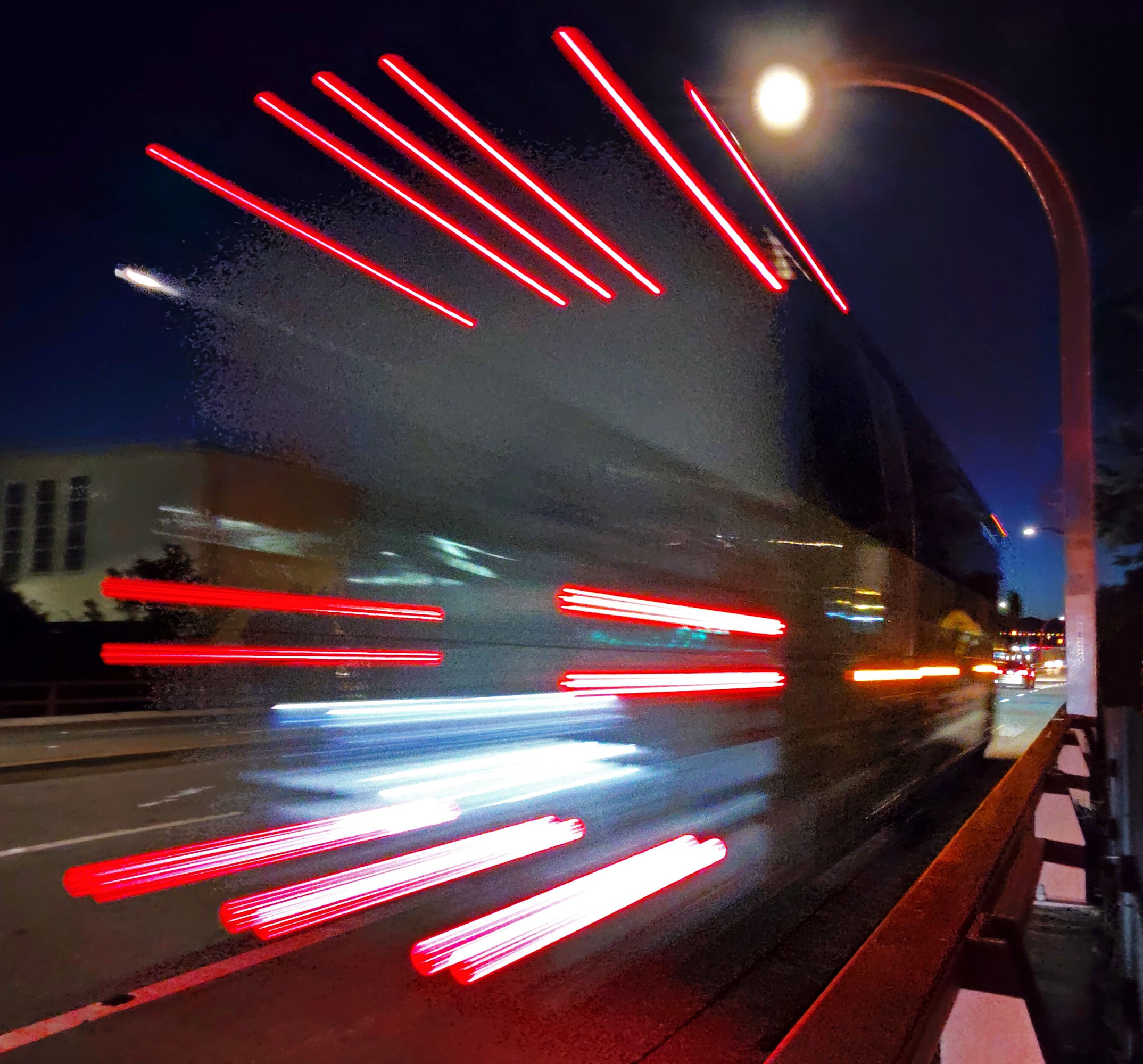 | 1st place prize, March 2026, special subject "Motion Blur". Another attempt at light streaks from vehicle lights at night. I realized that buses are good subjects, plus I worked out that it helps to shoot at the back of vehicles in roughly their direction of travel in order to get good sculptural streaks. The Beam Pro really shined here with it's wider stereo base than my Hydrogen One phone, and the wide angle lenses made it fill the frame nicely.