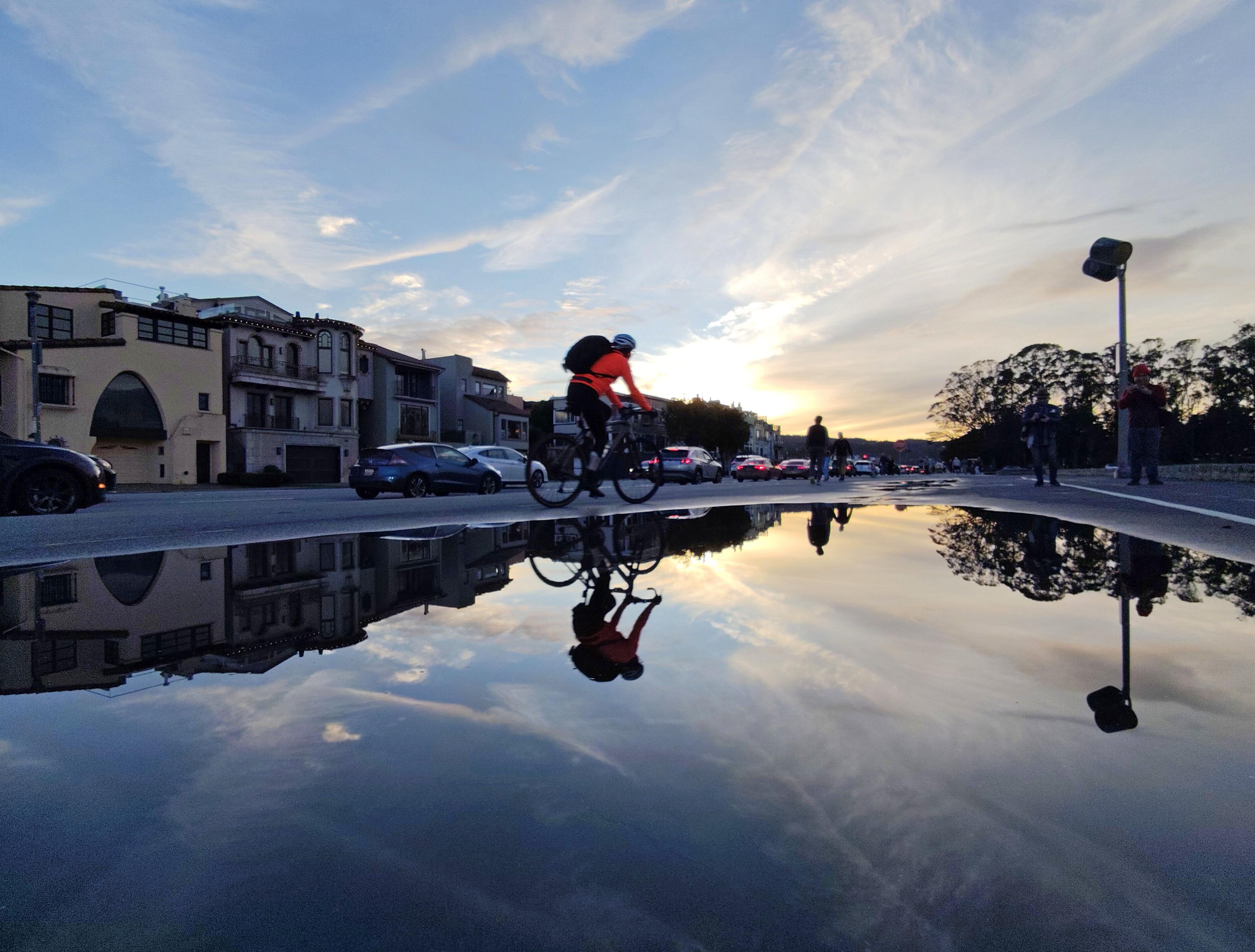 2nd place prize, February 2026, special subject "Contre-Jour & Silhouette". Reflected contrails made a natural cross when I caught this cyclist at their intersection.